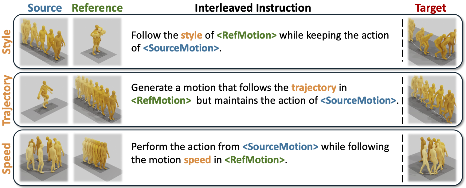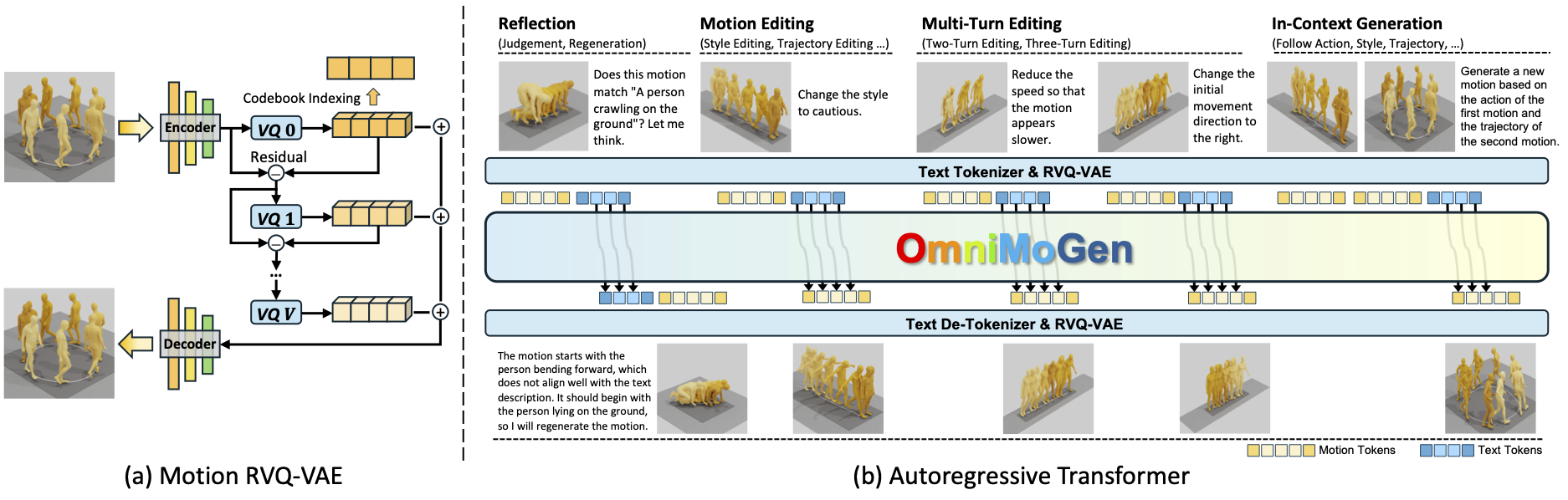 To address this, we propose OmniMoGen, a unified framework that enables versatile motion generation through interleaved text-motion instructions. Built upon a concise RVQ-VAE and transformer architecture, OmniMoGen supports end-to-end instruction-driven motion generation.