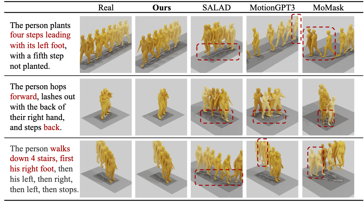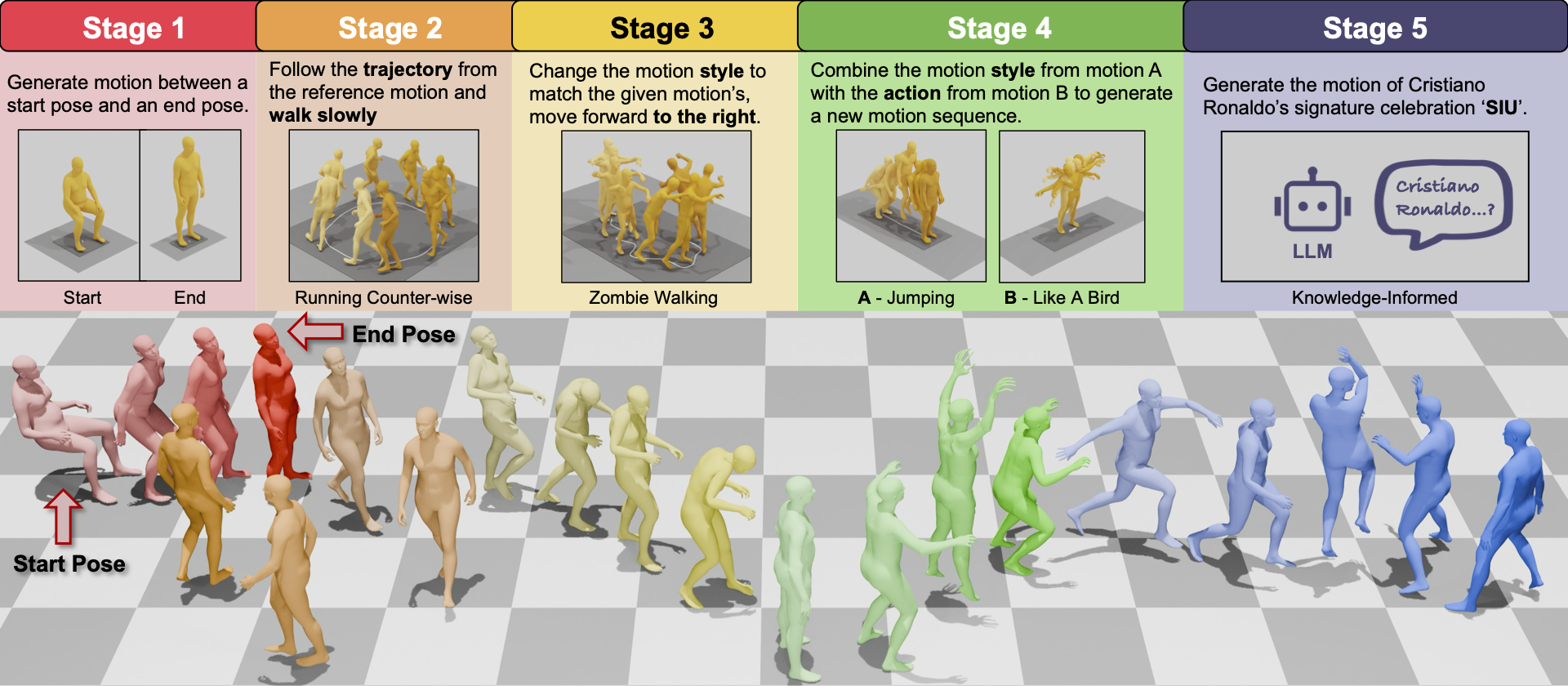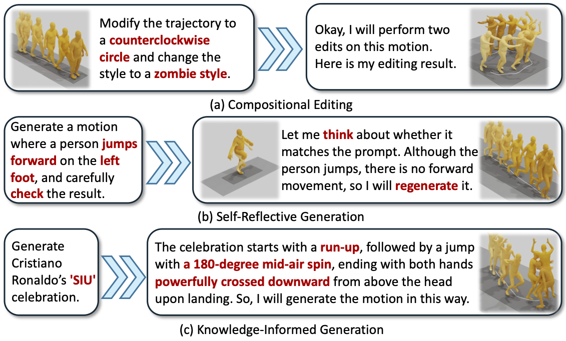 Through unified training on interleaved instructions, OmniMoGen exhibits strong emerging capabilities beyond basic generation, including compositional editing, self-reflective refinement, and knowledge-informed motion synthesis.